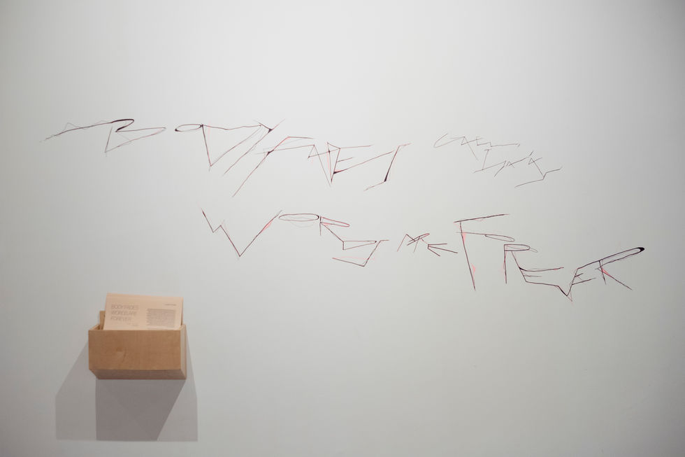 En esta serie de piezas que transitan alrededor de la palabra escrita y hablada, Gael Isaías no busca producir sentidos abiertos: nos muestra el resultado de su viaje por la constelación de palabras que le producen un sentido a su existencia, palabras con las que vive, goza, respira, danza, canta y fragmenta, para mostrarnos la pulpa viscosa del lenguaje, a través de varios procedimientos de materialización: por medio de la poesía visual, la poesía sonora, la fotografía intervenida en clave performática, en un ejercicio que nos permite entender que antes de la palabra está el cuerp_, y desde ese sitio de la epidermis y sus variadas sensaciones y sensibilidades, nos coloca en un espacio liminal, ahí donde el texto y su visualidad, la palabra y su condición erótica, se unen como manifiesto de una vida en estado perpetuo de emoción.