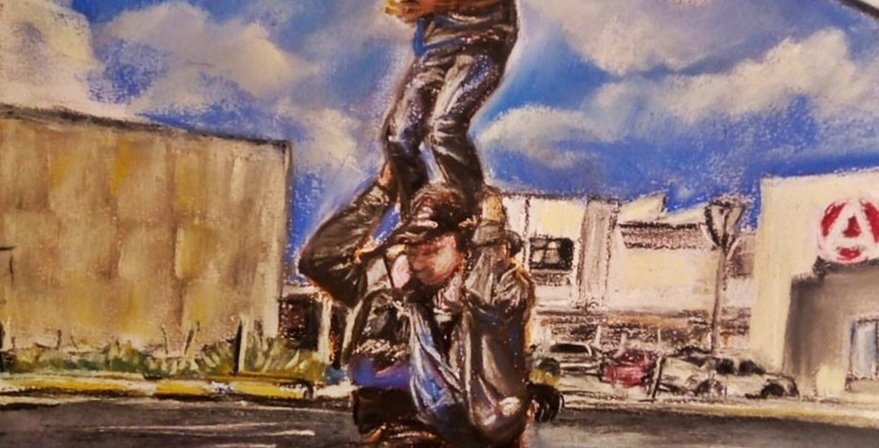 ―Acostumbro tomar fotos con el teléfono celular para piezas que quiero presentar como pintura. A veces tomo fotos pensando en una pieza que haré y después no lo hago. Mi proceso en general es ir a un lugar a vivir algo que luego traduzco en una pieza; por ejemplo, cuando iba a la escuela de artes me iba a caminar al Mercado Municipal y le tomaba una foto a un indigente con una paloma muerta y luego los dibujaba; ese el proceso general, esa emoción e impacto es lo que va a quedar en la pieza. Para la exposición Mil artistas visuales de México tomé una foto de borrachito con su perro y una foto de unos niños columpiándose de un poste con los cables caídos; eso lo vi en la Colonia Satélite y eso después lo dibujé.
