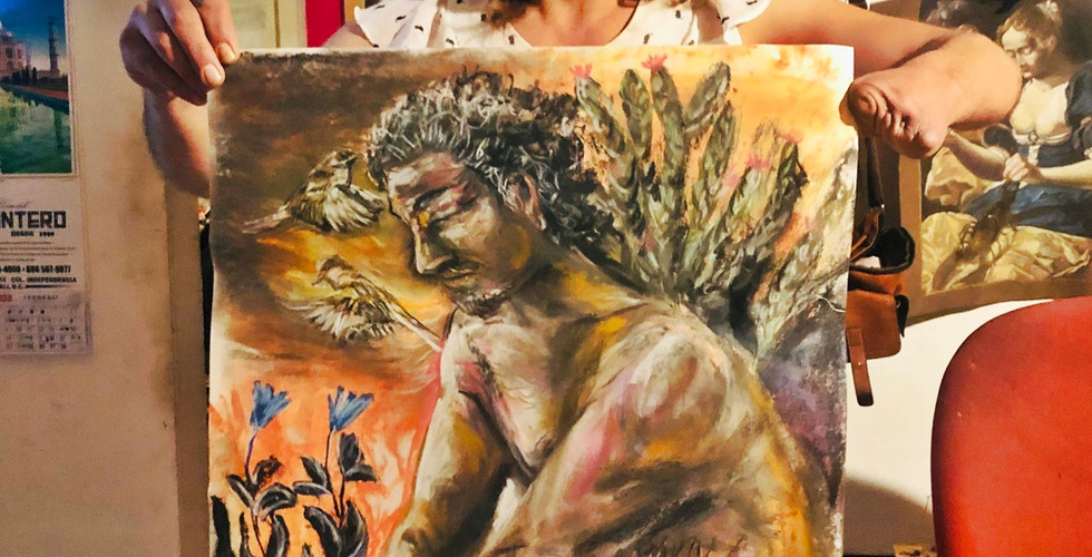 ―Ese fue el primer libro que leí de poesía por mi gusto, era una antología poética y también el nombre del poema. Tenía como 14 años y recuerdo que le leía los poemas a mi mamá, a mi papá y a un hermano y dije: "¡Válgame!", me gusto mucho, ahí estaba en la mesa leyéndoles poesía muy chila, muy ruda, desgarradora, muy emocional. Todo empezó porque cuando tenía como 11 años jugaba futbol en un centro comunitario y biblioteca que se llama Rosario Castellanos, en el Fraccionamiento El Cóndor, donde también hacía la tarea, y pensé que tenía que saber quién era esa señora y cuando lo supe me hice fan de su poesía. Esa exposición fue una retrospectiva pictórica de mi obra a lo largo del tiempo y se sobrepuso la cuestión de mi identidad a la cuestión pictórica. Fue una relectura de mi obra a la luz de mi cambio de identidad, entonces, alguna obra que tenía arrumbada cobró sentido y otra que tenía como buena perdió sentido; al final traté de que fuera muy personal la obra que expuse y que hablara sobre la libertad de expresar la propia identidad.